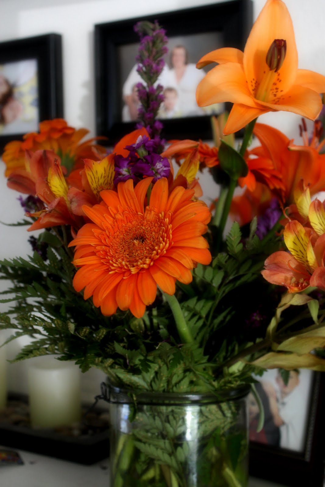 On fathers day for the last 3 years Hubz has worked the Nascar Races in Sonoma, Ca. He loves it and heck it's his day right? Who am I to say no! Well this year he came home and from the race with his usual goodies PLUS.....flower's for ME!!! I got flowers for fathers day!!!! And they're in some of my favorite colors and 2 of my favorite flowers. Have I told you how much I love this man? So I'm sharing my BEAUTIFUL Father's Day flowers with you.
