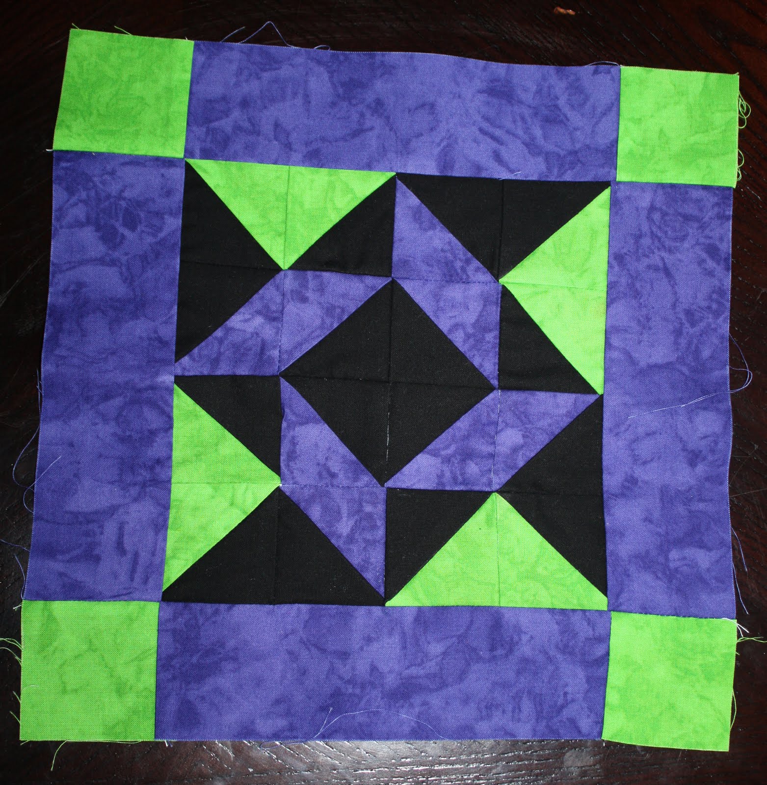 So I panicked after my last BOTM meeting and I just knew the Quilting God's HATED me after my first train wreck of a block and then this one has some pro's shaking in their boots. So I was totally freaked out. The good thing about being a visual learner, is Once I do something I can do it a million times after learning. And the good thing about this block was it's again 1/2 triangles, so I knew what I was doing it was just going to be arranging them in a different order. I was so happy with this block, I only had to rip one set of seams and re-sew it but that was because I was talking on the phone when I did it and sewed it right to wrong lol. When I finished the center piecing I actually cried happy tears because I was so excited with how easy and well it went together....that was until....dun dun dun.... the top edge didn't match up. It was 1/2 in. too long...I measured all my seams in the piecing and they all seem to be 1/4 in or just a hair off but this had me freaking out... Now happy tears turned back into frustrated tears. I put it away for a few day's so I could breathe and re-group. I fixed it and then put it all together.... It's kinda warped looking in the photo but it's not that bad in real life.